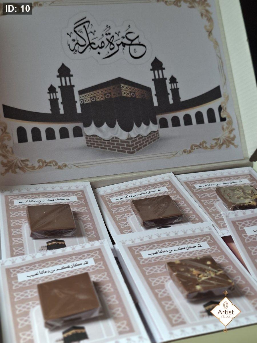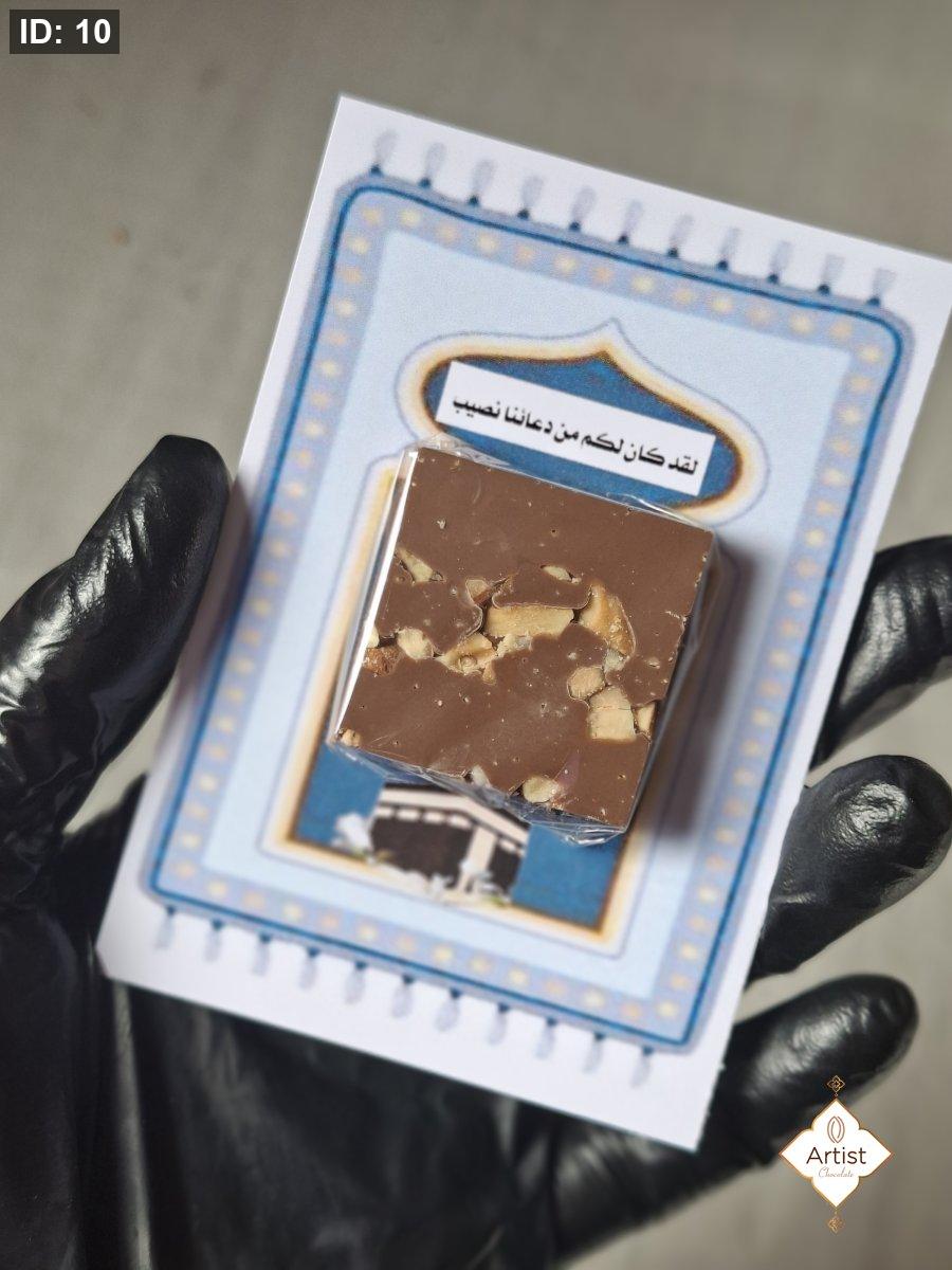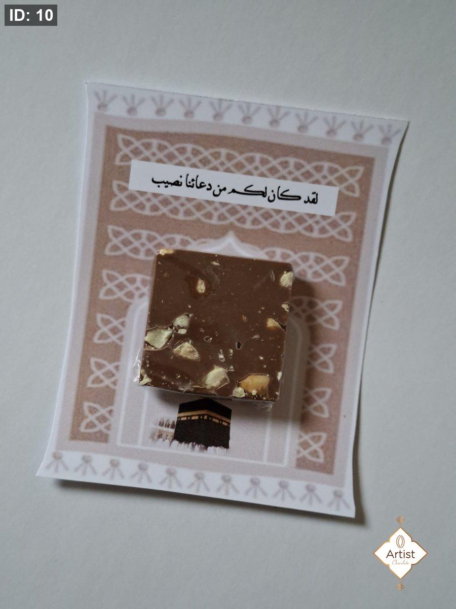 توزيعة شوكولاتة أنيقة ببطاقة على شكل سجادة صلاة، تحمل عبارة «لكم من دعانا نصيب»، مرفقة بقطعة شوكولاتة بلجيكية سادة أو محشية بأجود أنواع المكسرات.