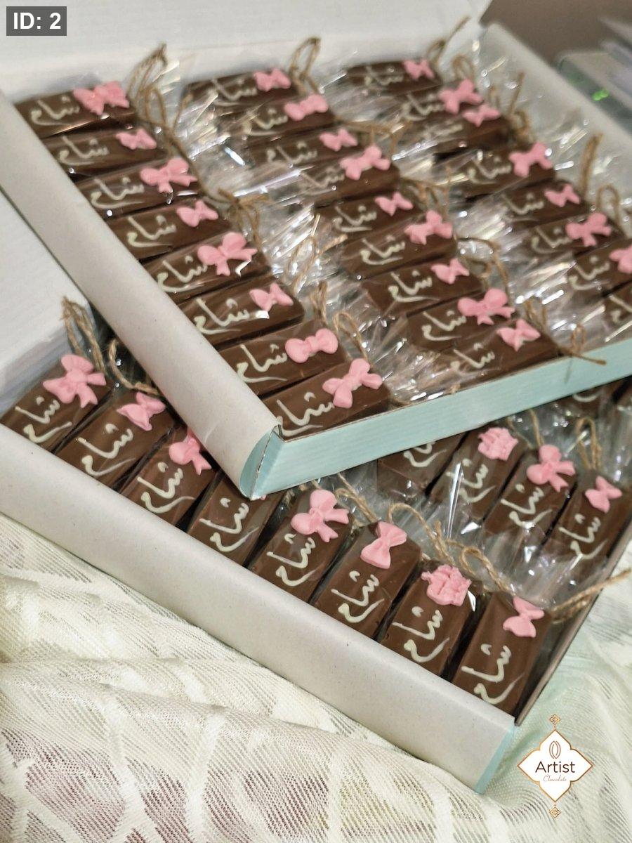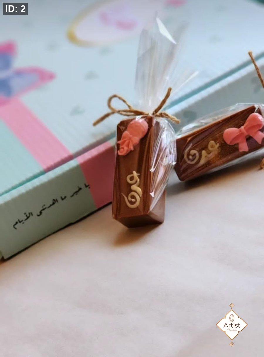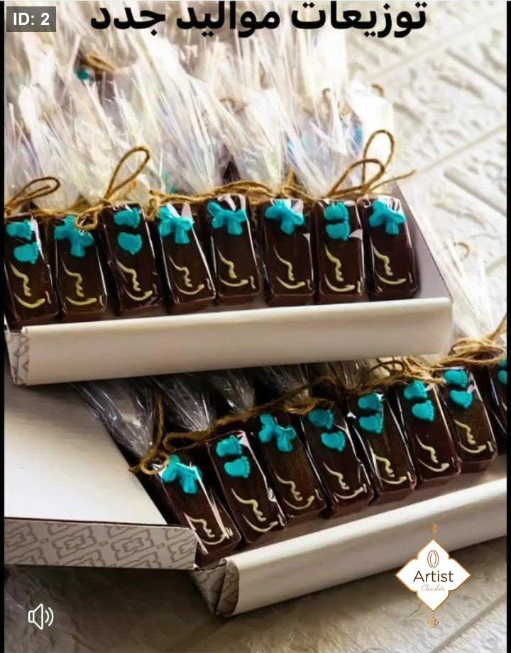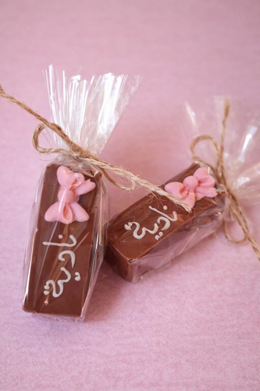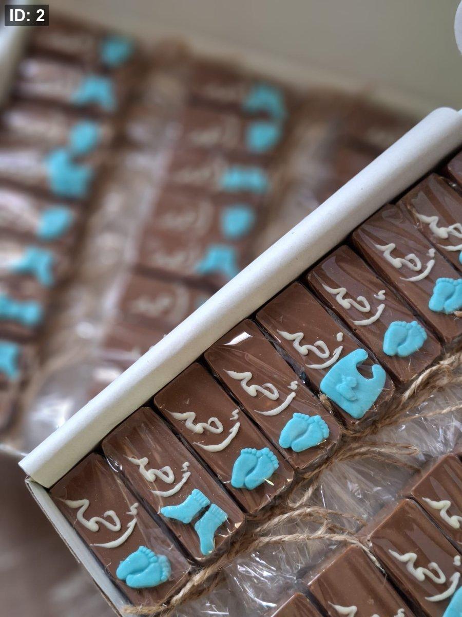 قطع شكولاتة فاخرة بشكل مستطيل محشية بالمكسرات والكرانشي والبسكويت المقرمش مزيج طعم غني وقوام ممتع .. لمسة حلوة تضيف فرح لكل توزيعة مواليد