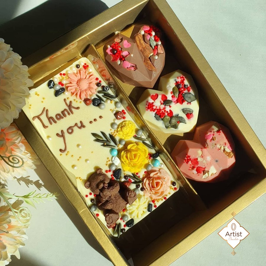 بوكس أنيق بلمسة حب ناعمة، لوح أبيض مزين بدبدوب وثلاث قلوب ليحكي عن مشاعر دافئة وتفاصيل لطيفة. مثالي للهدايا الرومانسية والمفاجآت الجميلة، مع شوكولاتة بلجيكية مصنوعة بحب تضيف للحظة طعم لا يُنسى.