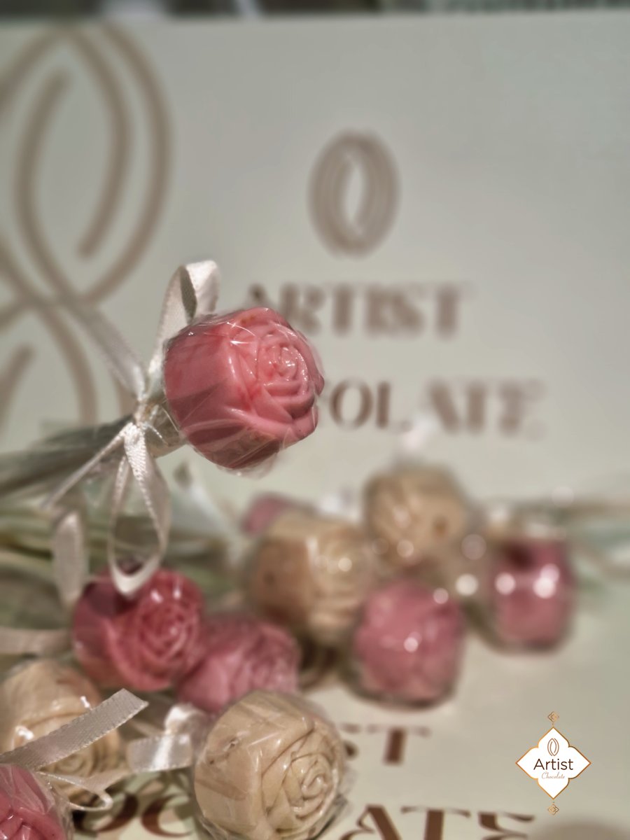 شكولاتة بلجيكية بيضاء كريمية على شكل ورده مغلفة مع عود لتتميزي بضيفاتك